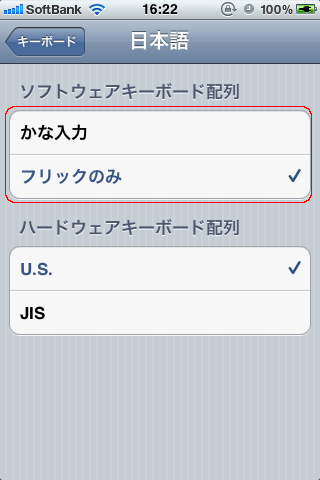 ソフトウェアキーボード配列で「フリックのみ」を選択